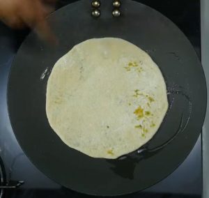 - Roast the other side till brown spots appear and apply ghee to the paratha.