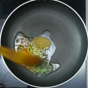 - Add ½ inch minced ginger, 1-chopped green chili, ¼ tsp of turmeric powder, and ½ tsp of coriander powder to the pan.